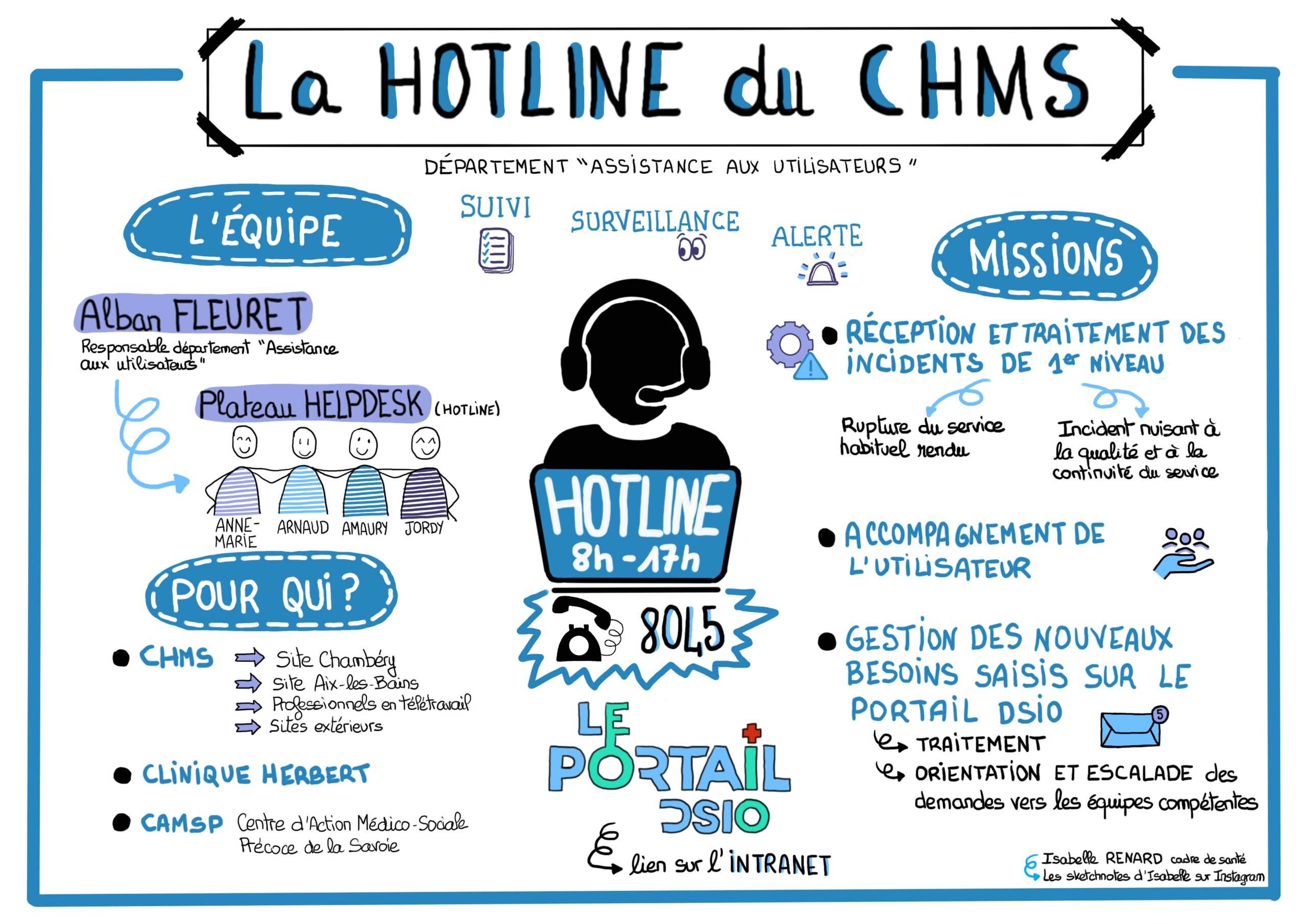 Utiliser un sketchnote pour communiquer sur un service de l'hôpital ! La HOTLINE informatique du Centre hospitalier Métropole Savoie - CHMS , composée de 4 collaborateurs, a pour mission l'assistance [...]
