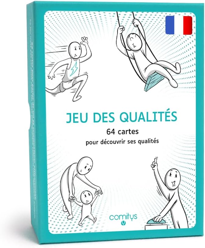 - CONTENU – Version Française – 64 cartes qualités colorées et numérotées, comportant chacune 4 qualités : 1 qualité principale au recto ainsi que 3 qualités voisines au verso ; une notice d’utilisation comportant des repères essentiels sur les qualités ainsi que 10 règles de jeu inspirantes mais aussi une liste complète des 256 qualités du jeu ; une boîte cartonnée aussi bien solide qu’élégante.