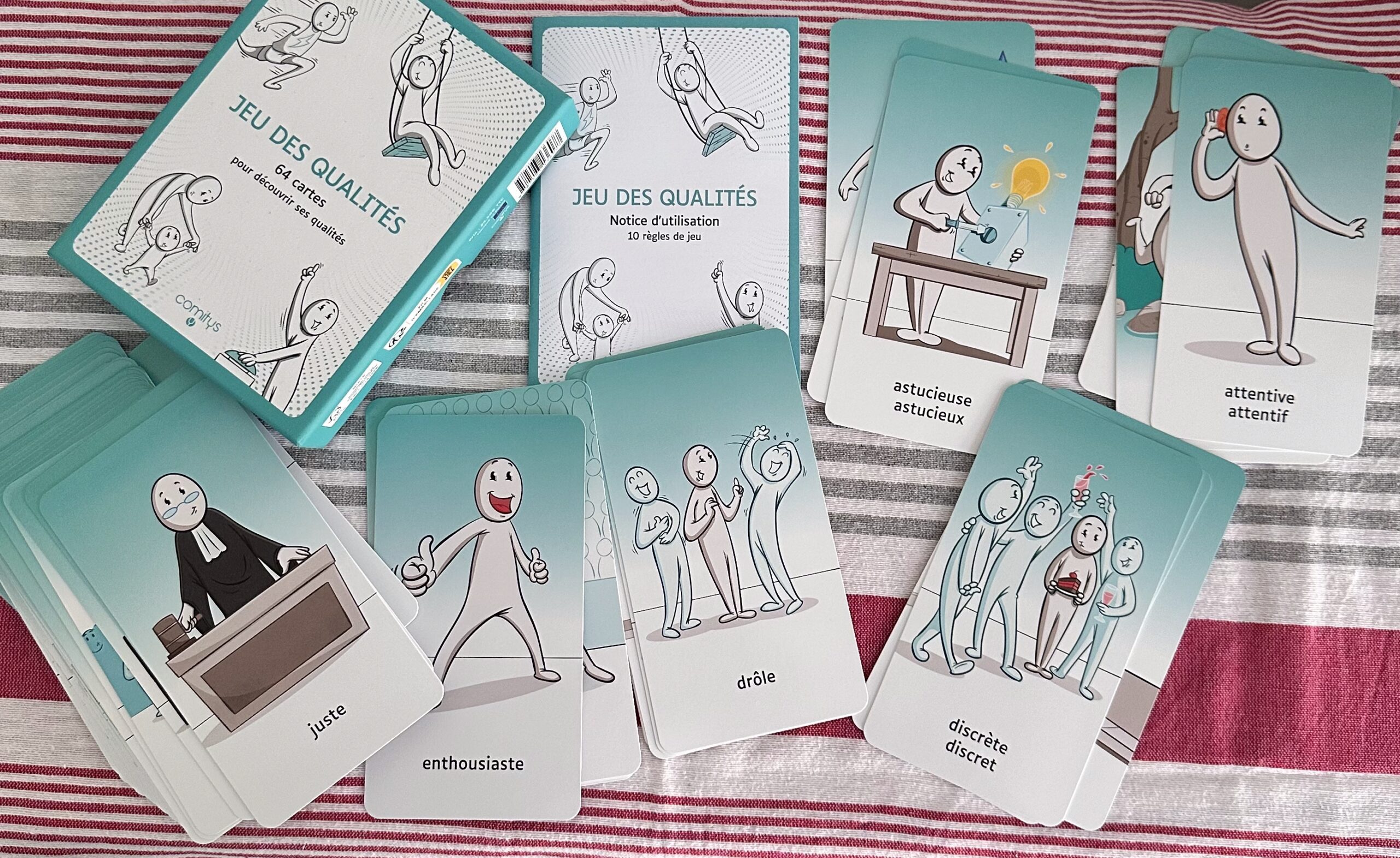 - OBJECTIFS – Version Française – Chaque participant apprend à : nommer les qualités ; reconnaitre ses qualités ; relier une qualité à une compétence ; argumenter sur les qualités. Il permet de : consolider son Estime de soi ; déployer son registre lexical sur les qualités ; parler de soi avec finesse et précision ; se projeter dans l’avenir, encouragé par ses qualités ; coopérer mais aussi nourrir son sentiment d’appartenance au groupe. Le Jeu des qualités vous permet d’explorer 256 qualités humaines.