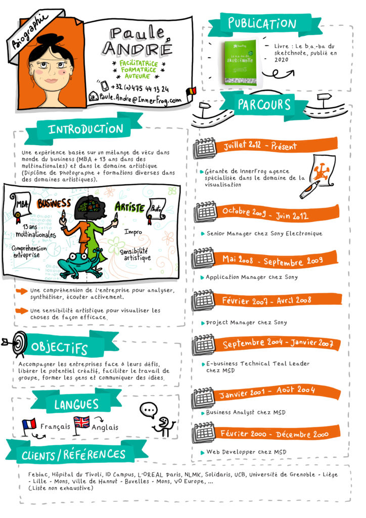 Petite société belge de facilitation visuelle, InnerFrog sort en auto-édition son premier livre Le b.a.-ba du sketchnote : un bouquin ludique et presqu’entièrement dessiné pour apprendre facilement à utiliser les outils et techniques visuelles pour faire passer un message, prendre des notes plus efficacement, mieux réfléchir à des décisions, communiquer des idées…