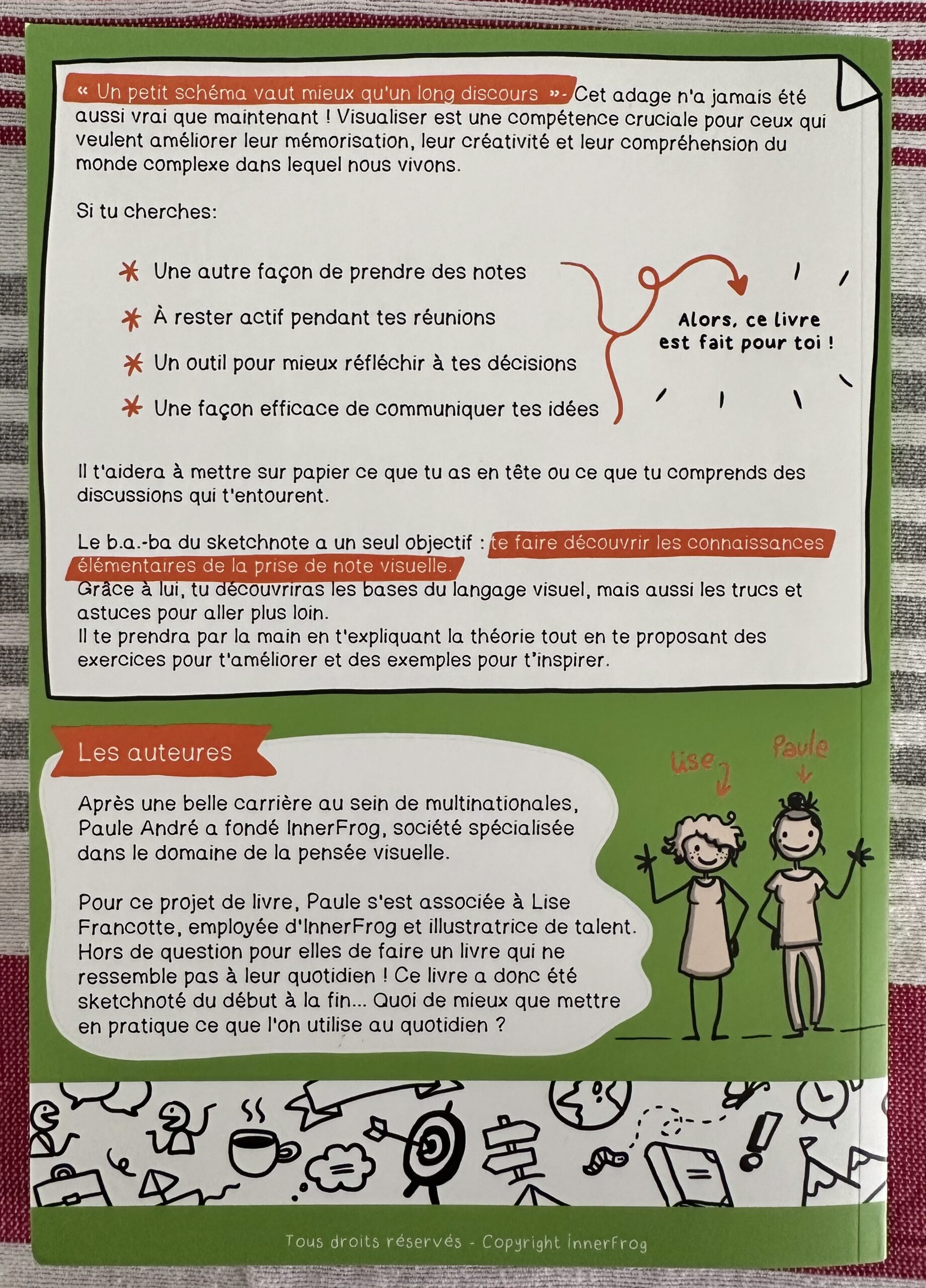 Petite société belge de facilitation visuelle, InnerFrog sort en auto-édition son premier livre Le b.a.-ba du sketchnote : un bouquin ludique et presqu’entièrement dessiné pour apprendre facilement à utiliser les outils et techniques visuelles pour faire passer un message, prendre des notes plus efficacement, mieux réfléchir à des décisions, communiquer des idées…